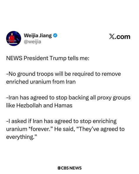 President Trump said in a phone interview that Iran has “agreed to everything,” and will work with the U.S. to remove its enriched uranium.