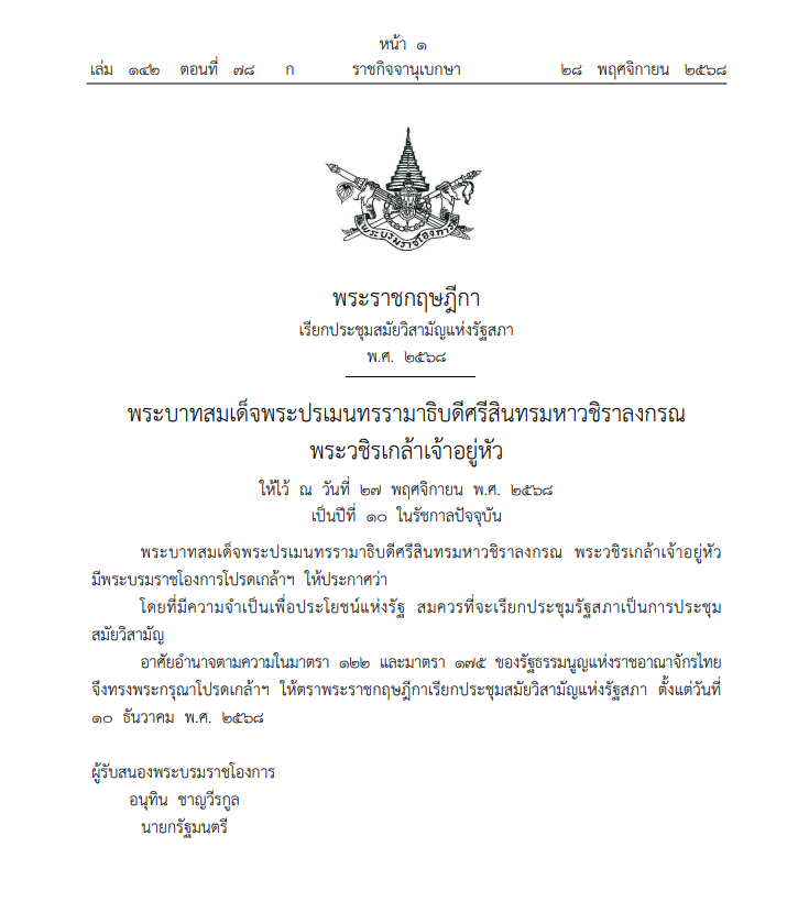 ราชกิจจานุเบกษา ๒๘ พฤศจิกายน ๒๕๖๘ พระราชกฤษฎีกาเรียกประชุมสมัยวิสามัญแห่งรัฐสภา พ.ศ. ๒๕๖๘
